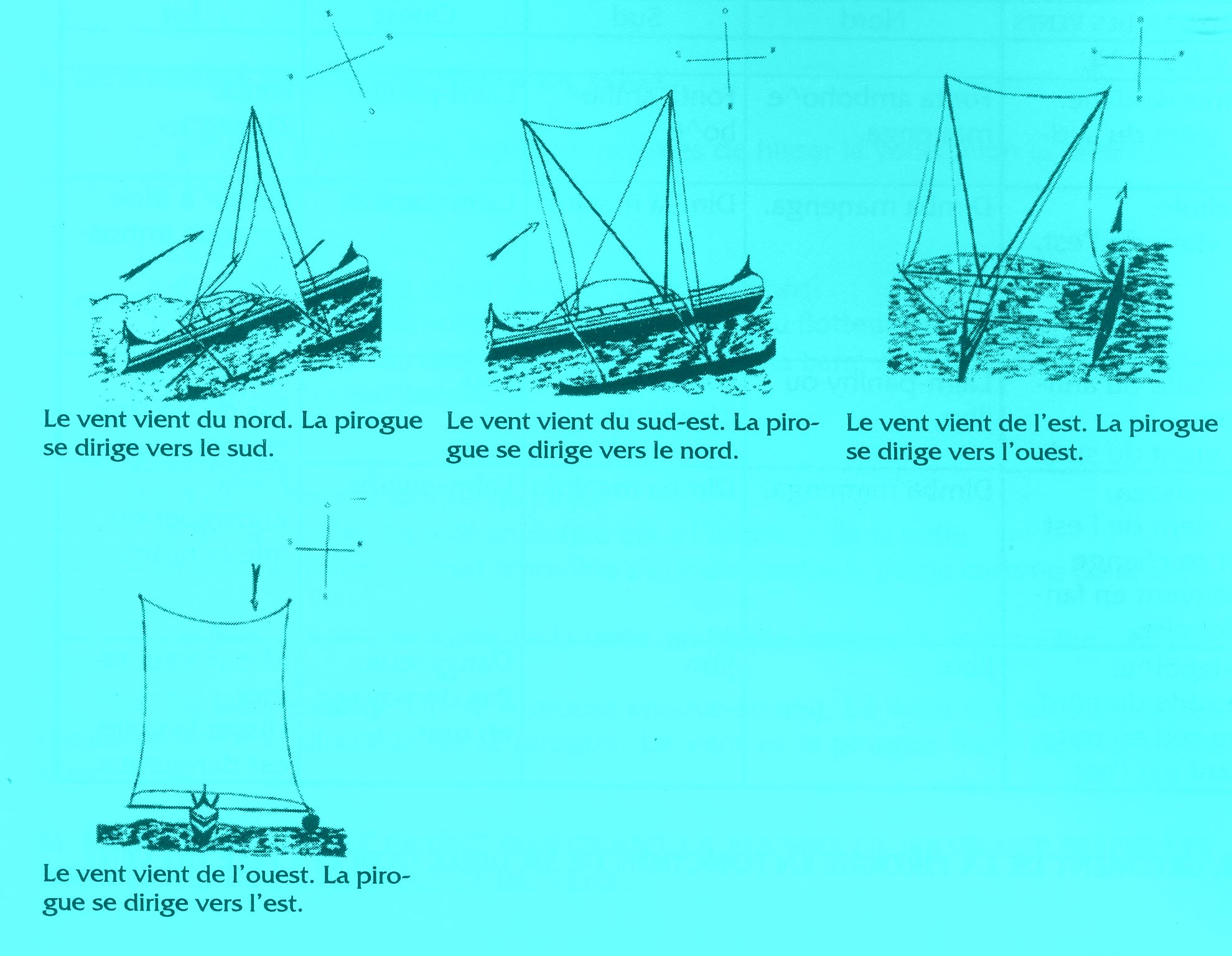 M. TABLEAU A DOUBLE ENTREE MONTRANT LA MANIERE DE NAVIGUER SELON LES DIRECTIONS DE LA PIROGUE ET DU VENT.