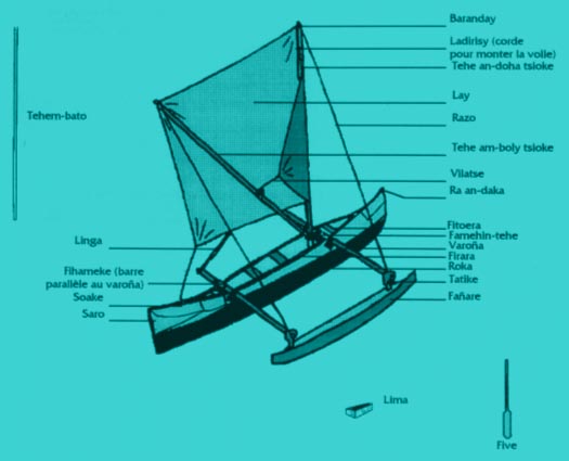 - Le dimba fahare. Un côté de la voile est fixé au flotteur-balancier.